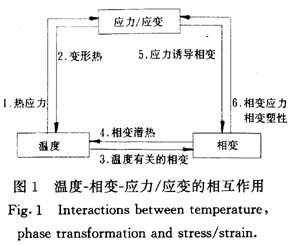 鋼在淬火過程中存在極為復(fù)雜的溫度、相變、應(yīng)力/應(yīng)變相互作用,在此方面已有許多報道[1]。如圖1所示,在淬火過程中,溫度造成熱應(yīng)力并影響材料的力學(xué)參數(shù)(彈性模量、泊松比、屈服強(qiáng)度和應(yīng)變硬化率等),從而影響材料的力學(xué)行為。應(yīng)力/應(yīng)變則以變形熱的形式反過來影響溫度的變化。隨著溫度的降低,在達(dá)到相變條件后將發(fā)生相變。溫度是決定相變的因素之一,但其本身又受著相變潛熱的影響。內(nèi)應(yīng)力的存在,可通過一種通常稱為應(yīng)力誘導(dǎo)相變的機(jī)制而影響相變的進(jìn)程。在相變過程中,各組成相的比容差異將造成相變應(yīng)力,同時由于材料的絕大多數(shù)參數(shù)除了依賴于溫度實際上也依賴于相態(tài),因此,相變也會對材料的力學(xué)行為產(chǎn)生影響。此外,在有內(nèi)應(yīng)力存在時相變過程中還會伴隨一種“反!钡乃苄孕袨,即材料在應(yīng)力低于屈服強(qiáng)度的情況下就可以發(fā)生不可逆變形的現(xiàn)象,稱為相變塑性。