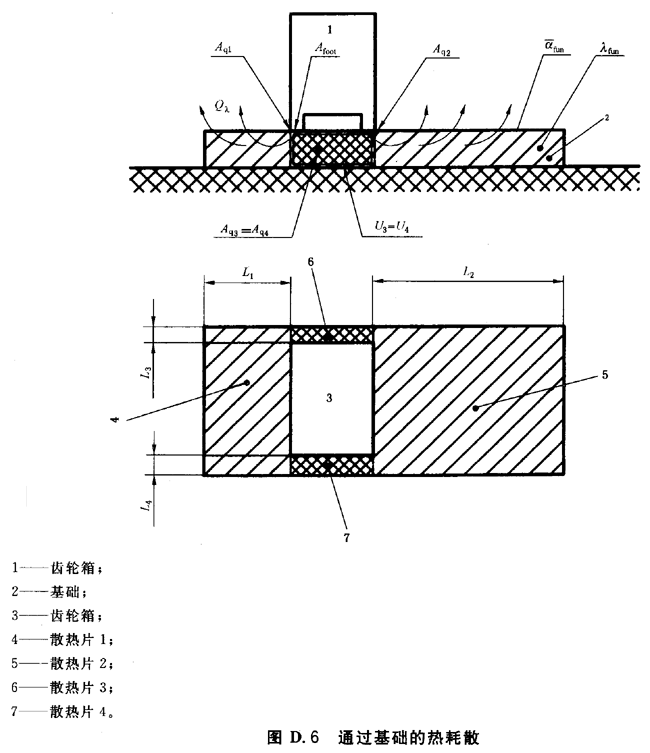 基礎傳導的熱計算是建立在將齒輪箱基礎分割成幾個部分,每一部分被看作為一個單獨的散熱片,使用從熱力學得出的已知散熱片計算公式。沿各部分表面的熱流Aqi相加得到整個基礎的熱傳導量(見圖D.6)。