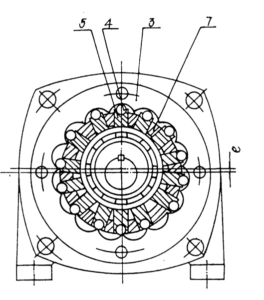 | 一種適用于機(jī)械傳動裝置的內(nèi)齒減速機(jī),包括由輸入軸(1)聯(lián)接的偏心機(jī)構(gòu)及驅(qū)動圈(7),固齒圈(3)等部分組成,其特征在于沿驅(qū)動圈(7)外圓徑向開設(shè)有等分導(dǎo)槽,并與驅(qū)動圈(7)的內(nèi)環(huán)槽相通,在每個等分導(dǎo)槽的兩邊裝有擋塊(6),使之形成四周封閉的槽孔,在槽孔內(nèi)裝有滑桿(5),滑桿(5)的一端呈R形面,并裝有滾動體(4)在槽孔中作徑向滑動,同時滾動體(4)與固齒圈(3)嚙合,滑桿(5)的另一端呈平面或弧面,接觸于偏心機(jī)構(gòu)中的雙偏心凸輪(2)的軸承外圈上,在雙偏心凸輪(2)上裝有與滑桿(5)嚙合的滾動軸承(10)。 |