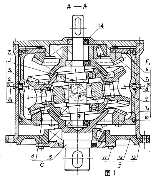 一種通用傳動機械。在已知圓錐齒輪波導減速器上,安裝兩對錐齒輪,增設螺旋換擋機構,當改變原動機或輸入軸的旋轉方向時,主動錐齒輪的工作齒面,撥動換擋機構沿著螺旋線運動,產生軸向位移,一對錐齒輪退出嚙合后,在助力器協助下,另一對錐齒輪進入嚙合,從而達到控向換擋的目的。本實用新型具有結構緊湊,換擋方便,可遠距離操縱等優點。既可制成軸轉式也可制成殼轉式。添配相應的電氣元件,還可實現自動換擋。特別適用于化工攪拌機、船舶起錨機、起重卷揚機等需要正、反兩種方向、速度、扭矩頻繁變化的傳動機械領域。