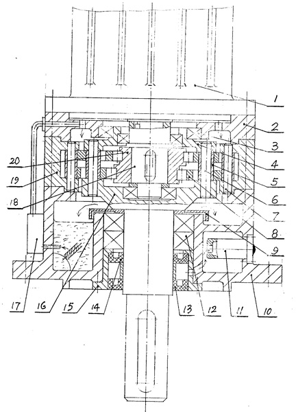 | 一種釜用不泄漏減速機(jī),由擺線輪[8]、輸入軸[18]、偏心軸承[20]、機(jī)座[10]、針齒輪及W輸出機(jī)構(gòu)組成,其中針齒輪由針齒殼[19],均布在針齒殼上的針齒[7]構(gòu)成,W機(jī)構(gòu)由輸出軸[16]與均布在輸出軸圓盤上的柱銷[6]及柱套[5]構(gòu)成,其特征在于: a)機(jī)座[10]內(nèi)有一儲油腔,機(jī)座外壁有一油泵[17]用來將儲油腔的潤滑油泵至減速機(jī)頂端由上而下對機(jī)件進(jìn)行潤滑; b)在輸出軸支承軸承[12]頂端有一圓環(huán)蓋[9],其高度高于儲油面1~3cm,用以防止從沿輸出軸漏油; c)在輸出軸軸承[12]下端有一個密封組件,它由套筒[15]及裝在套筒內(nèi)的密封[13]、[14]構(gòu)成,二密封之間要有一定空間,密封組件用以防止有毒介質(zhì)從反應(yīng)釜中泄漏到減速機(jī)內(nèi)腔。 |