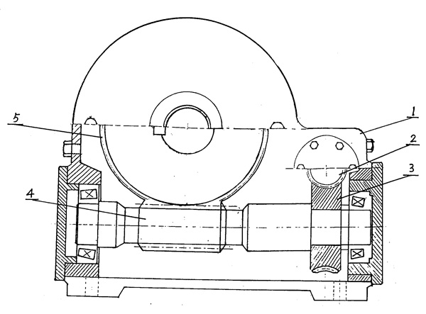 卷簾機專用減速機,其包括有:機殼(1)、主蝸桿(2)、主蝸輪(3),在機殼(1)內主蝸輪(3)與主蝸桿(2)聯接,其特征在于:主蝸輪(3)與從蝸桿(4)聯接,從蝸桿(4)與從蝸輪(5)聯接。
