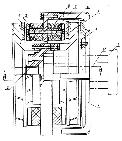 一種電渦流減速機,由支架(1)、線圈固定盤(2)、葉輪(3)、軸套(4)和電氣控制箱(5)組成,其特征在于: a、線圈固定盤(2)包括線圈(6)和固定盤(7),線圈(6)固定于固定盤(7)的芯軸內,扇形板(8)、支架蓋(9)依次緊壓于固定盤(7); b、固定盤(7)通過法蘭盤(10)與支架(1)聯接為一體安裝于變速箱(11)上; c、軸套(4)裝于變速箱(11)的傳動軸(12)上,一對葉輪(3)分別裝于軸套(4)兩邊上; d、線圈(6)由旋鈕開關(13)與電氣控制箱(5)聯接。