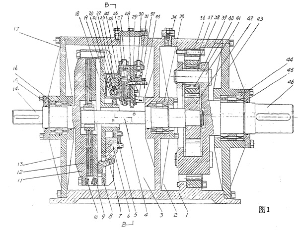 | 一種軟啟動減速機,在其機殼(1)及端蓋的軸承座中裝有輸入軸(14)、輸出軸(46)、其間裝有減速齒輪組,其特征在于: 輸入軸(14)連接一組摩擦片離合器,該離合器主要由裝在軸壓盤(11)與壓爪盤(8)之間的壓盤(9)和摩擦片組(12)構成,該軸壓盤(11)、壓盤(9)及壓爪盤(8)以螺釘(17)連接為一體,該壓盤(9)與軸壓盤(11)之間裝有分離彈簧(10);該摩擦片組(12)至少包括兩片外片(121)及夾持于外片之間的內片(122),該內片中心固接一花鍵套(123); 在摩擦片離合器與減速齒輪組之間以一花鍵軸(4)連接,該花鍵軸(4)的花鍵端連接花鍵套(123),另端以鍵連接齒輪(42),其中部由機體(1)的中間軸承座(35)支承;在摩擦片離合器的壓爪盤(8)的外側面上裝有軟啟動器(3),其構造為:在壓爪盤(8)上鉸接有等分圓周的至少二組壓爪(7),該壓爪的內臂(701)接觸壓盤(9),該壓爪(7)的外臂(702)接觸離心塊(6)的頂端,該離心塊(6)裝在壓爪盤(8)的徑向滑槽(801)中,該離心塊(6)鉸接于連桿(5),該連桿(5)傾斜鉸接調速齒輪(19),該調速齒輪(19)固裝在壓爪盤(8)的空心軸套(802)上;該調速齒輪(19)連接時間調節器(18); 至少二組時間調節器(18),其數量與壓爪(7)的數量相同,各安裝在軟啟動器(3)相鄰兩壓爪(7)之間的壓爪盤(8)上,每一時間調節器(18)的構造為:在時間調節器外殼(48)中平行地安裝有螺桿式軸齒輪(21)和軸齒輪(22),該螺桿式軸齒輪(21)螺接套裝有一內螺紋式齒條(20)而可軸向移動,該內螺紋式齒條(20)與調速齒輪(19)嚙合,該螺桿式軸齒輪(21)與軸齒輪(22)的同軸齒輪(23)嚙合,該軸齒輪(22)與齒條式空氣缸(24)的齒條嚙合,該齒條式空氣缸(24)的內螺紋端與導向桿(26)的外螺紋端涂密封膠螺接,該導向桿(26)外圓套裝彈簧(27),該齒條式空氣缸(24)內孔中裝有柱塞(25),該柱塞(25)另端固定于機殼(1),該齒條式空氣缸(24)徑向移動與套裝于其內部的柱塞(25)之間形成氣室,該氣室經柱塞(25)、節流閥(29)、空氣過濾器(32)與外界空氣相通;該柱塞(25)上端受套裝在導向桿(26)外圓上的彈簧的壓力,該齒條式空氣缸(24)側面插入開鎖銷(28)的頭部,該開鎖銷(28)中部以銷軸(47)鉸接于開鎖銷(28),其尾 |