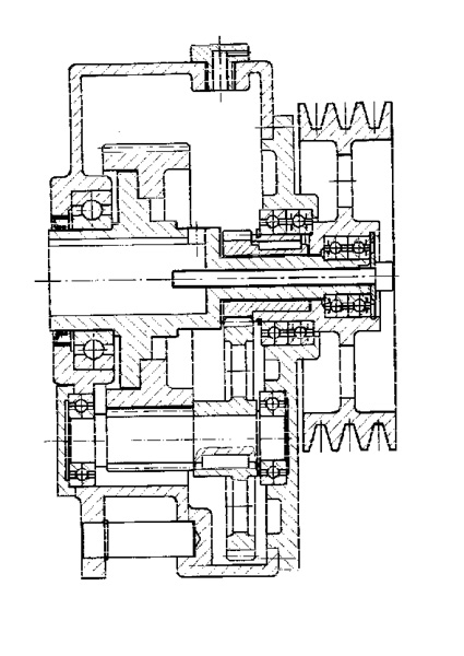 一種同軸式軸裝減速機,主要由皮帶輪、圓機殼[1]及裝在機殼內的傳動齒輪組成,其特征在于: (1)二級傳動齒輪,其中初級齒輪為Z1、Z2,齒輪Z1與皮帶輪輪轂聯接一體,由軸承[2]支承在端蓋[6]孔中,端蓋聯接在機殼端面上,次級齒輪為Z3、Z4,軸齒輪Z3上裝有齒輪Z2,齒輪Z4與輸出軸[3]裝配一體; (2)輸入齒輪Z1與輸出齒輪Z4同軸線,即同軸傳動; (3)輸出軸[3]內有通孔,用以裝配配套主機的傳動軸,傳動軸用螺釘[7]擰緊,防止減速機脫落,輸出軸[3]兩端分別用軸承[4]與[5]支承在機殼與皮帶輪輪轂孔中,端端[6]與機殼端面聯接; (4)機殼下端有兩處圓弧凸緣,銷[8]置于二凸緣孔中。