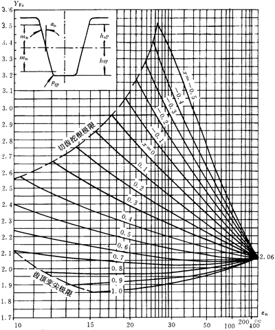 應力修正系數Ys僅能與齒形系數YF聯用。對于an齒形角為20°的齒輪,Ys可按式(207)計算。對于其他齒形角的齒輪,可按此式近似計算Ys.