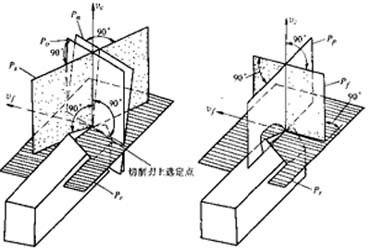 (1) 定義刀具角度的參考系:為了定義刀具切削部分的幾何角度,需選定適當(dāng)組合的基準(zhǔn)坐標(biāo)平面作為參考系。其中用于規(guī)定刀具設(shè)計(jì)、制造、刃磨和測(cè)量時(shí)幾何參數(shù)的參考系稱為刀具靜止參考系,如圖2-2所示。規(guī)定刀具進(jìn)行切削加工時(shí)幾何參數(shù)的參考系稱為刀具工作參考系。