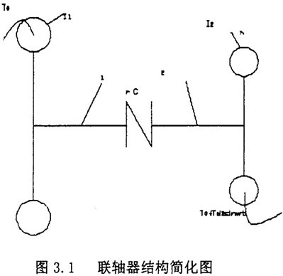 為了便于求解運動微分方程,需要對傳動軸系中聯軸器的主動和從動兩側的轉動慣量和剛度作力學模型的簡化。根據具體結構情況,可以將軸系簡化為若干個等效轉動慣量圓盤,以具有某一剛度的周聯系起來。通常比較典型的是簡化為兩個等效的圓盤,配置在聯軸器的兩側。并設定所聯兩軸的剛性很大,只有聯軸器具有彈性和阻尼。如圖3.1所示