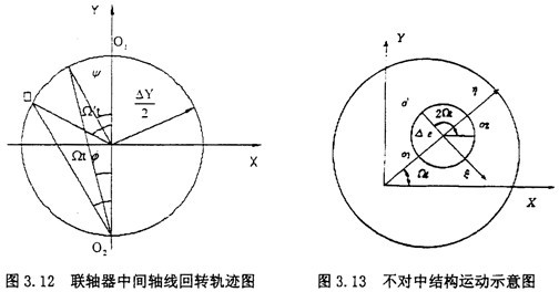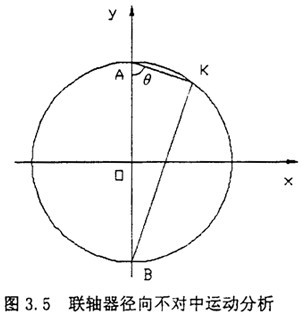 (2)當轉子軸線之間存在徑向位移時(如圖3.3所示),聯軸器的中間套齒與半聯軸器組成移動副,不能相對轉動,但是中間套齒與半聯軸器產生相對滑動而作平面圓周運動,即中間套齒的中心是沿著以徑向位移△y為直徑作圓周運動,如圖3.4所示。