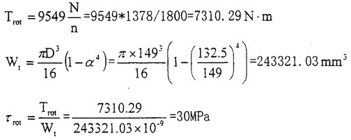 根據(jù)實(shí)際情況計(jì)算出工作時(shí)的剪應(yīng)力:GK2型內(nèi)燃機(jī)車啟動(dòng)發(fā)電機(jī)ZQF-38TH,115V,38KW,1170~358Or/min;GK2型內(nèi)燃機(jī)機(jī)用柴油機(jī)型號(hào)為MTU16V396TC14,持續(xù)功率為1378KW,旋轉(zhuǎn)角速度為18O0rod/min。柴油機(jī)冷區(qū)液溫度為40℃時(shí)最小啟動(dòng)轉(zhuǎn)矩包括加速余量約8OON.m,曲軸扭矩約75ON.m