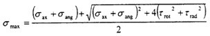 此時(shí)的應(yīng)力情況屬于三向應(yīng)力狀態(tài),所以其分析過(guò)程和徑向不對(duì)中900以及2700以情況相似,只是這里還有了附加的軸向拉應(yīng)力和附加的角向應(yīng)力,將各個(gè)應(yīng)力值σxx=σax+σang,σyy=0,σzz=0,τxy=τrot,τyz=0,τzx=τrad分別代入式(4-29)(4-30)(4-31)中,可以得到