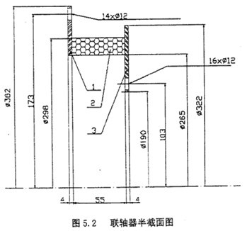 根據實際情況觀察可知橡膠塊左右分別有兩塊鋼板,析能上能下均有一些圓孔,通過實際測量得到聯軸器的基本尺寸和形狀。由于聯軸器為軸對稱圖形,故只畫出其截面圖(圖5.2)。