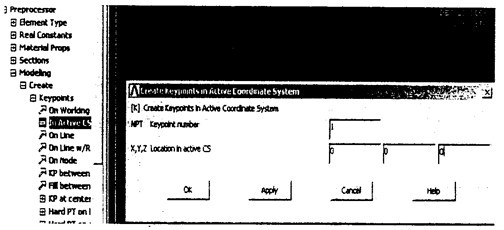 選擇Main Menu>Preprocesor>Modeling>Create>Keypoints>In Active CS,在彈出的對話框中輸入1關鍵點的坐標,如圖5.11所示。單擊“Apply”輸入下一個點的坐標直至所有關鍵點完全輸入。6個關鍵點的坐標如表5.1所示。