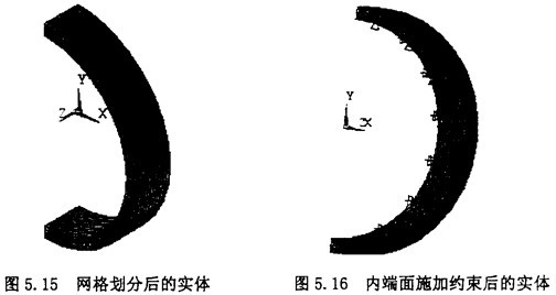 首先,在圓環內端面上施固定約束,選擇Main Menu>Solution>Define Loads>Apply>Structural>Displaedment>On Areas命令,選擇圓環內端面。施加約束后,效果如圖5.16所示。