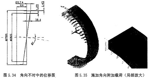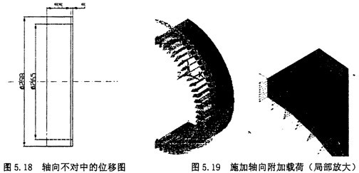 軸向不對中時,根據實際情況取中量為△ax=5mm,則可以認為外端面沿z軸方向的位移為5mm,如圖5.18所示。產生的附加的軸向載荷按照。選擇選擇Main Menu>>Solution>Define Loads>Apply>Structural>Force>Moment>On Nodes命令,選擇圓環外端面上所有的節點,在出現的對話框中選擇比,并在輸入value文本框中輸入39。加載后的結果如5.19所示。旁邊為局部放大圖。