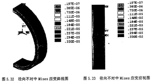 3.顯示節點的Von Mises應變云圖:選擇Main Menu>General Postproc>plot Result>NodalSolu,在彈出的對話框內選擇“Strain”,第二欄內選擇“Von Mises Strain”,則其顯示的云圖如圖5.32,5.33所示,從圖上可以看出應變最大的位置出現在橡膠圓環的最下端。