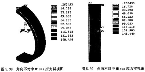 2.顯示節點的Von Mises應力云圖:選擇Main Menu>General Postproc>Plot Result>NodalSolu,在彈出的對話框內選擇“Stress”,第二欄內選擇“Von Mises Stress”,則其顯示的云圖如圖5,38,5.39所示