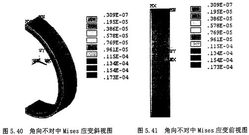 3.顯示節點的Von Mises就變云圖:選擇Main Menu>General Postproc>Plot Result>NodalSolu,在彈出的對話框內選擇“Strain”,第二欄內選擇“Von Mises Strain”,則其顯示的云圖如圖5.40,5.41所示