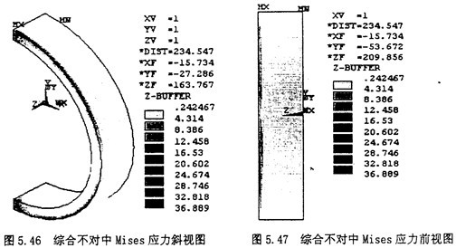 2.顯示節點的Von Mises應力云圖:選擇Main Menu>General Postproc>Plot Result>NodalSolu,在彈出的對話框內選擇“Stress”,第二欄內選擇“Von Mises Stress”,則其顯示的云圖如圖5.46,5.47所示