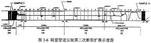 實驗二的斷口均為剪切斷裂,裂紋擴展長度為33.6m。由于1W和1E沖擊功低于預測的止裂沖擊韌性,因而裂紋均沿1W和lE軸向直線擴展并分別進入2W和2E樣管,最后在2W和2E樣管中止裂,如圖3-6所示。