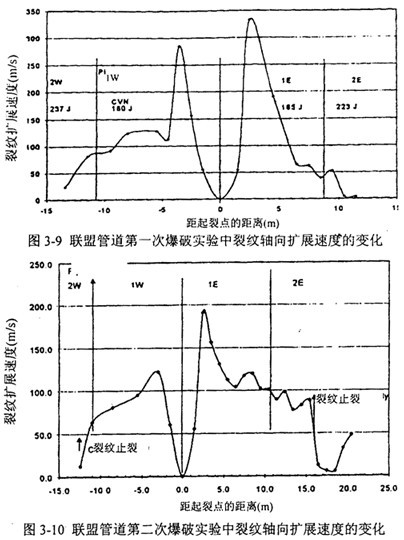 全尺寸爆破實驗一般設有一根有預制裂紋的低韌性鋼管在管段中部作為起裂管,兩側焊接鋼管的韌性沿裂紋擴展方向遞增排列。裂紋從起裂管向兩側擴展,停止擴展部位的鋼管韌性就是設定運行條件下的管線止裂所需的韌性。斷裂擴展速率在低韌性的起裂管開裂后測量。