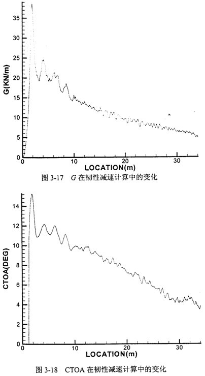 圖3-17和圖3-18是針對西氣東輸某特定設計參數的管線,應用韌性減速機理計算時能量釋放率G和裂紋尖端張開角CTOA的變化。