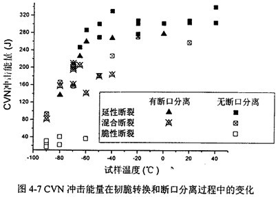圖4-7選擇的管線鋼在實驗溫度范圍內同時經歷了韌脆轉化和斷口分離,對上述結論給予了證實,并可以看到發斷口分離的試件的韌性稍低于未發生斷口分離的試件。