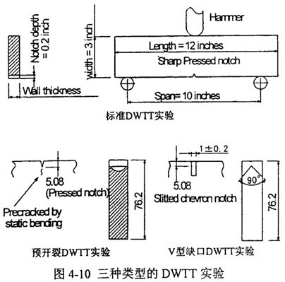 實驗證實,對有上臺能的控軋鋼進行的實驗中,標準DWTT實驗比夏比沖擊實驗在評價延性裂紋擴展行為上有更好的對應關系。但對于高韌性的淬火回火鋼,標準DWTT試樣由于在起裂過程中吸收了大量的功,致使裂紋擴展的應變速度過低而與真實擴展狀況不符。采用靜態預制裂紋DWTT試樣或雙試樣DWTT法是解決這一問題的兩種方案,如圖4-10所示。