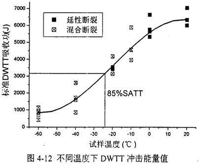 隨著裂紋擴展成為一系列小的薄片,斷口分離使得軸向傳播的裂紋尖端充分顯露出來,從而減小了管子的有效壁厚,降低韌脆轉化溫度,使材料整體上更適于低溫使用。當斷口表面發生大量分離時,相應的延性斷裂功會有所降低。為了準確地測定材料的斷裂韌性,應盡可能避免斷口分離現象的發生。與CVN實驗類似,DWTT沖擊韌性也隨溫度的升高而增加。圖4-12給出了與圖4-6相對應的具有上臺能的控軋鋼材標準DWTT吸收功與溫度的變化關系。DWTT試樣和夏比試樣的厚度差異導致了兩圖85%SATT不同。