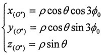 ≈o,cosθ≈1(實際上p<<L,近似處理是合理的),則可得到三小桿的球面中心P在固定坐標系o′X′Y′Z′中的運動軌跡: