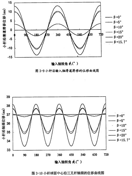 由曲線圖3-9可以看出,小桿沿滑道的位移隨兩軸夾角β的增大而增大,變化量也比較大,變化頻率為一個回轉周期1次。這可以作為三叉桿萬向聯軸器設計中,小桿長度的設計依據。