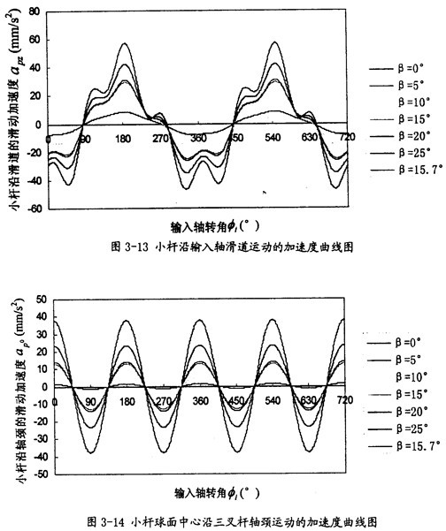 由曲線圖3-14可以看出,小桿球面中心P沿軸頸的線加速度,變化頻率為一個回轉周期2次。隨兩軸夾角β的增大其最大值增長較快,它的值可以作為動力分析和設計計算的重要依據。