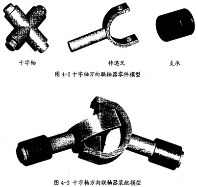 當前,在工程領域,應用美國PTC公司的CAD軟件Pro/E和美國MDI公司的動力學仿真軟件ADAMS聯合進行復雜機械系統的動力學仿真研究是一種較實用、較流行的仿真方案。本文的仿真分析中所有模型均是采用這種方案。考慮到建模的注意因素,在用Pro/E建模的過程中,省去了十字軸萬向聯軸器的許多細小結構,如潤滑部分、滾針軸承、彈簧卡圈等,只是保留了十字軸萬向聯軸器在原理上進行傳動的必需構件和運動副。在此原則下建立的十字軸萬向聯軸器的各構件模型如圖4-2所示,實際上只包含十字軸和傳遞叉兩個活動構件。建立的十字軸萬向聯軸器的裝配模型如圖4-3所示。