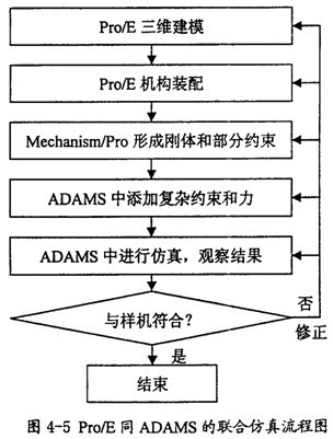 在仿真中如果發現結果不對,則我們需要對前面的模型進行修正,然后再做仿真分析,直到結果正確。決而言之利用Pro/E和ADAMS進行聯合仿真,其基本的步驟如圖4-5所示。