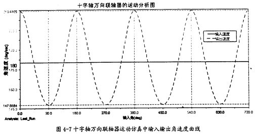 由圖4-9可以知道,當輸入軸轉速恒定為90o/s時,輸出軸并不作恒速轉動,而是以90o/s為中心,作非常有規律的周期性運動,在每一個回轉周期中,它的變化頻率為3次。這里的結果同第三章中的曲線圖3-8也是完全吻合的,因此在一定的程度上也證明了三叉桿萬向聯軸器轉速分析理論的正確性。