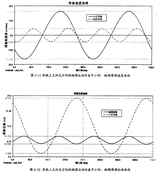 由圖4-12可以知道,在一定的夾角下,小桿在滑道中的滑移位移同小桿球面中心相對軸頸的滑移位移是不同的,前者(20.76mm)要遠大于后者(2.93mm),且它們變動的頻率也不一樣,在一個回轉周期中,前者步率是1次,而后者2次。此圖中的兩曲線同第三章中的理論分析曲線圖3-9、圖3-10是吻合的。這在一定的程度上也證明了三叉桿式萬向聯軸器理論分析中對小桿滑移位移和軸頸滑移位移這兩項計算的正確性。