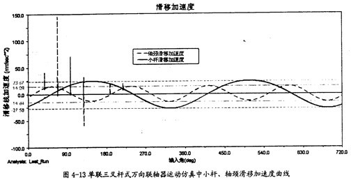 由圖4-13可以知道,在一定的夾角下,小桿在滑道中有滑移加速度同小桿球面中心相對軸頸的滑移加速度是不同的,前者要大于后者,且它們變動的頻率也不一樣,在一個回轉周期中前頻率是1次,而后者2次。此圖中的兩曲線同第三章中的理論分析曲線圖3-13、圖3-14是吻合的,只是小桿滑移的加速度曲線在外形上有差異,仿真的曲線相當的平滑、規則,但理論分析曲線卻不規則,這可能是在計算中簡化和省略的原因。盡管如下,這在一定的程度上也證明了三叉桿式萬向聯軸器理論分析中對小桿滑移加速度和軸頸滑移加速度這兩項計算的正確性。(值得說明的是此圖中曲線有時有突變的現象,主要是考慮到計算機的性能,計算中步長稍大的原故。在后面的分析曲線中也出現了這樣的情況,將不再作說明。)