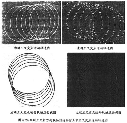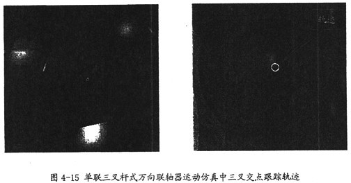 由圖4-15可以看出,在單聯三叉桿式萬向聯軸器的運動仿真中,三叉交點運動軌跡是一個圓,相對于半徑值R(此值的意義見第三章)它的半徑是相當小的,這也解釋了為何運動中兩軸夾角在不斷作微小的變化,同時也證明了軸頭中心軌跡理論的正確性。