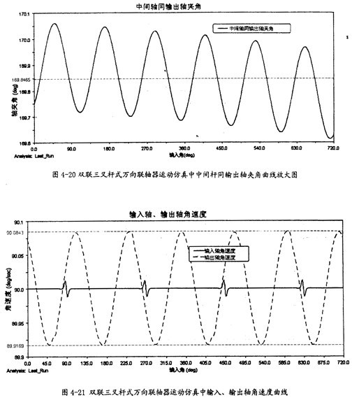 由圖4-19可以看出,雙聯三叉桿式萬向聯軸器在轉動的過程中,中間桿同輸入軸、輸出軸之間的夾角都在變化,且兩個夾角的變化的大小相差很大,一個較為平滑(β=10°),而另-個則以較大的幅度(18°)呈周期變化,在每-個回轉周期中,它的變化頻率為l次。
