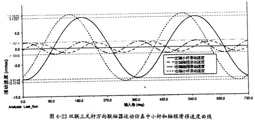 由圖4-23可以看出,雙聯三叉桿式萬向聯軸器在運轉的過程中,左右兩端的小桿滑移速度幾乎相等,左右兩端軸頸的滑移速度也接近等值,且軸頸的滑移速度比小桿沿滑道滑移速度要小得多,它們的變化頻率同單聯時的情況相比也無變化,在大小上同β=10°的單聯三叉桿式萬向聯軸器的特性是相同的。