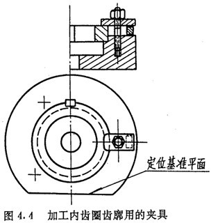 內齒圈齒廓的數控加工,是在齒圈外徑及兩端面都精加工后進行的,因此,應以端面及外徑作為定位基準。其夾具可做成螺釘壓板結構,如圖4.4所示。夾具內徑應盡量接近齒圈外徑,用千分表以夾具內圓為基準找正工作臺軸心。