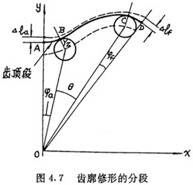 顯然,未經修形的齒廓曲線在齒頂鄰域和齒根鄰域嚙合的壓力角都很小,因而分段修形后應將頂、根部大致削去相同的區段。即