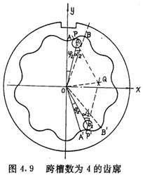 如圖4.9 所示,AB是其中一個齒槽的一側齒廓,A′B′是跨槽數為K(圖中k=4)的一個齒梢的另一側齒廓,它們是兩個性質不同的齒廓。若把AB看成是工作齒廓,則A′B′是非工作齒廓。選擇圖4.9所示的坐標系,讓坐標原點O與內齒圈幾何中心重合,y軸與OA重合。設P(x,y)為AB齒廓上的一點,在P點與內齒圈齒廓相接觸的外滾子的位置角為