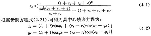 由上面可知,用數控加工齒廓時,應求出圓插刀中心的軌跡,它是被加工內齒圈齒廓曲線的內法向等距線,如圖4.3所示。圓插刀的半徑可不等于實際推桿減速器中滾子的半徑,只要刀具半徑Td小于內齒圈齒廓在齒根部的最小曲率半徑,在加工過程中不會發生切削干涉即可。對于激波器為偏心圓的推桿減速器,根據(2. 35)式,可得不發生切削干涉的條件為: