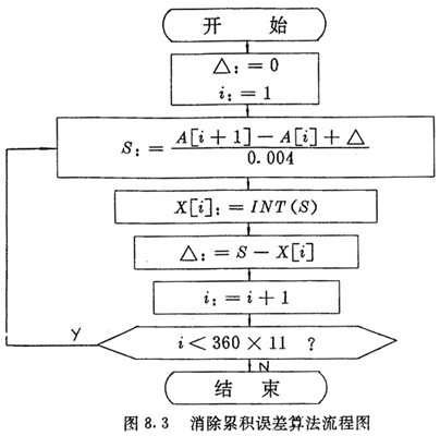 用式(4.4)及式(4.5)計算nx和nc時,得到的不可能恰好是整數,為了消除累積誤差,每段中應把上一段的誤差考慮進去。例如對nx的計算,假定表8.1中Pd的360×11個數已存在數組A中,計算后的360×11-l個脈沖數nx存在數組x中,則計算過程如圖8.3所示。