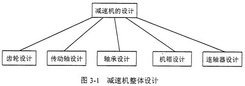 減速機,作為一個完整的傳動系統,其設計包括:齒輪設計,傳動軸設計,軸承設計,機箱設計以及連軸器設計,如圖3-1所示。