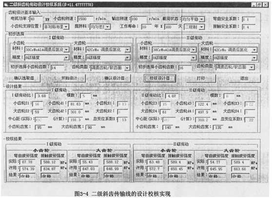 c、輪齒疲勞強度及其修正系數(ZNT、YNT、ZL、Zv、ZR、Zx、Yx、Yδreit、YRreIT)在這三類參數中,用戶參數是要由用戶給定,齒輪特性參數是要得到的結果,齒輪設計參數是一種中間描述參數,它需要通過一系列的復雜的計算求解,而齒輪設計的科學性也就是通過對齒輪設計參數的精確確定而實現的,具體計算機實現公式見3.6-3.8;齒輪的接觸強度與彎曲強度校核分別見3.3和3.4。系統的參數初始輸入界面見圖3-3。
