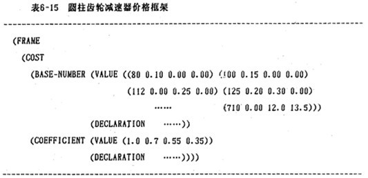 1.圓柱齒輪減速器價格主要考慮齒輪材料、精度,減速器中心距,總重量等因素,如表6-14。專家系統設計中,可用框架表示(表6-15 ):