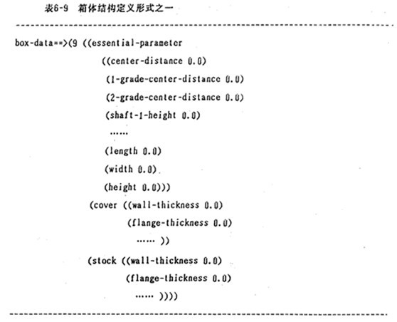 在進行圖1-1、圖1-2-1、l-2-2、1-2-3種類的圓柱齒輪減速器設計時,箱體是種類最多,變化程度最大的部件,因此,不可能建立一種統一的模式。根據傳動方案的不同,箱體形狀會發生很大的變化,設計工作量極繁重。通過分析,本系統采用的方法是通過框架來表達箱體設計的大量知識,如表6-11所示的框架是圖1-2-2 中第9號箱體的結構定義式。