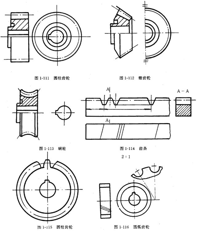 ③在剖視圖中,當剖切平面通過齒輪的軸線時,輪齒一律按不剖處理(圖1-111、1-112、1-113、1-114、1-117)。